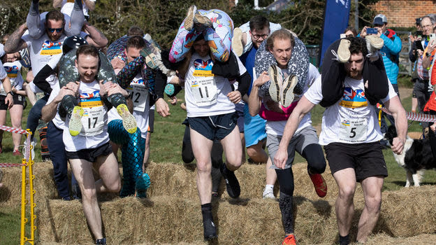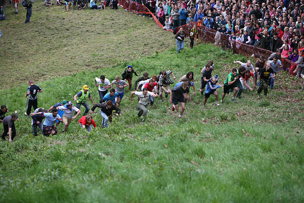 В английском графстве Глостершир ежегодно проводится одно из самых опасных и странных состязаний в мире — гонка за сыром. Участники бросаются с крутого холма Купера в погоне за катящейся вниз головкой сыра Double Gloucester.