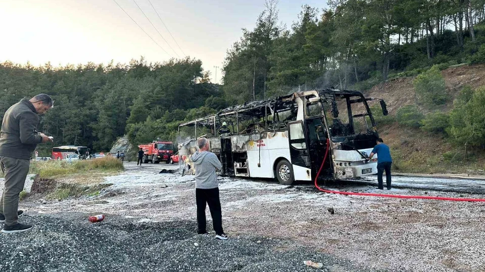 Инцидент произошел около 19:00 в районе Мезаргедиги на автодороге Мармарис — Датча в провинции Мугла. По предварительной информации, водитель заметил дым, поднимавшийся из моторного отсека автобуса, перевозившего туристов, после чего остановил транспорт в безопасном месте и оперативно организовал высадку пассажиров. Спустя короткое время после эвакуации автобус полностью охватило пламя.